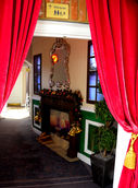 Set with wall, windows (backlit snow scene), fire surround, mirror, flame effect